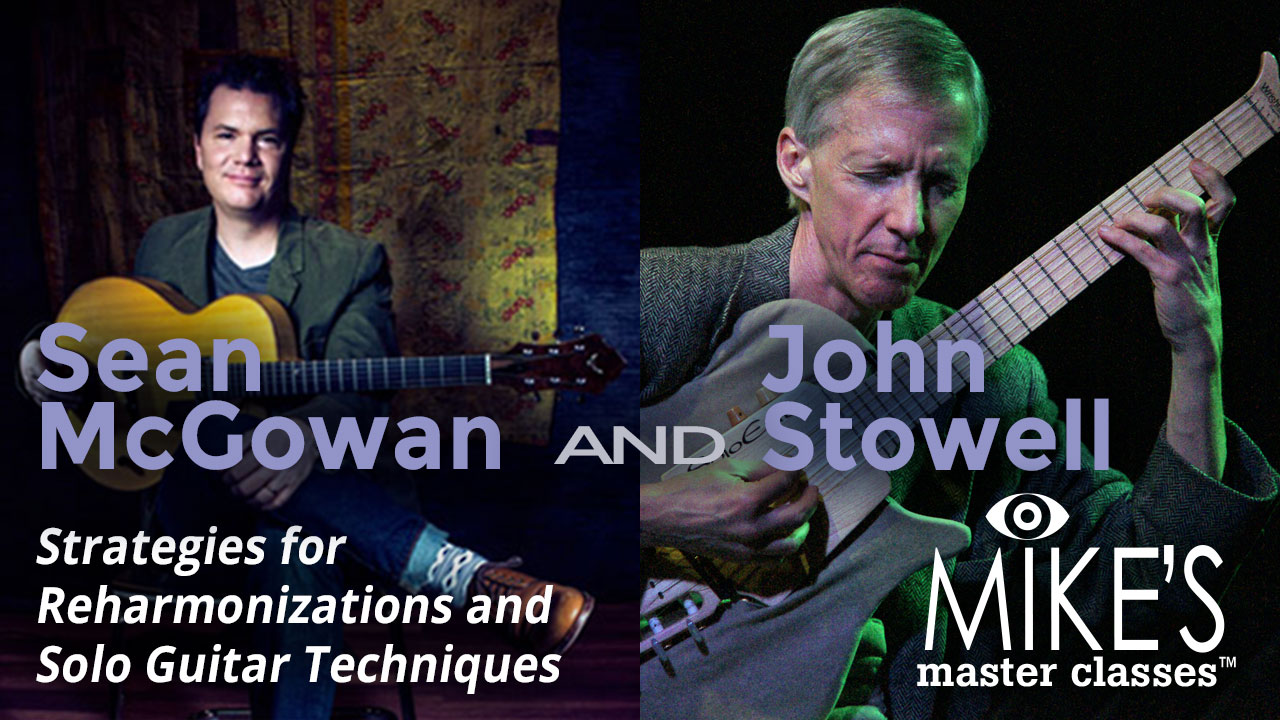 In this class, John and Sean initially trade choruses on “Alone Together”, demonstrating pedal points, voice leading, double stops, open string voicings, and re-harmonization ideas on common cadences and turnarounds. Other topics referenced include the importance of melody to internalize song form and as a reference and context for improvisation. Implied time versus obviously stated rhythm is also demonstrated.